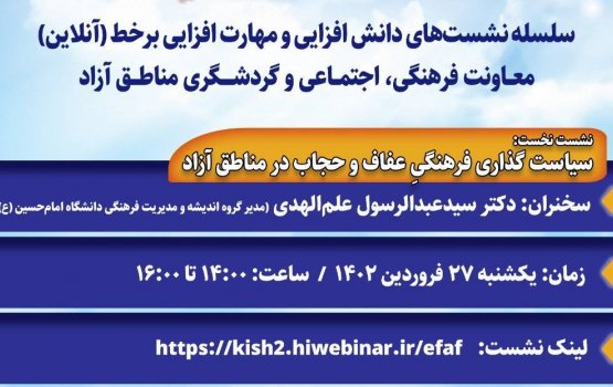 معاونت فرهنگی، اجتماعی و گردشگری مناطق آزاد تجاری ـ صنعتی و ویژه اقتصادی، سلسله نشست های برخط (آنلاین) دانش افزایی و مهارت افزایی در حوزه حجاب و عفاف مناطق آزاد را برگزار می کند.