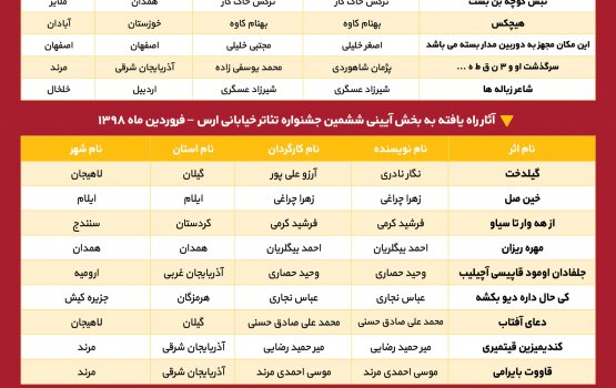 نتایج بازبینی ششمین جشنواره تئاتر خیابانی ارس اعلام شد گردشگران نوروزی ارس تماشاگر اجرای 100 تئاتر خیابانی در نوروز 98 خواهند بود.