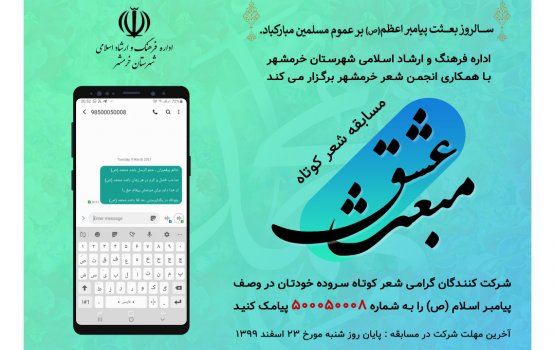 فراخوان مسابقه ادبی مبعث عشق منتشر شد سرپرست اداره فرهنگ و ارشاد اسلامی شهرستان خرمشهر، از انتشار فراخوان جشنواره ادبی «مبعث عشق»، خبر داد.