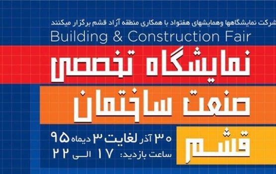 برگزاري دومین نمایشگاه تخصصی صنعت ساختمان وتجهیزات وابسته قشم دومین نمایشگاه تخصصی صنعت ساختمان و تجهیزات وابسته قشم با همکاری سازمان منطقه آزاد قشم و شرکت نمایشگاهها و همایش های هفتواد در منطقه آزاد قشم برگزار مي شود.