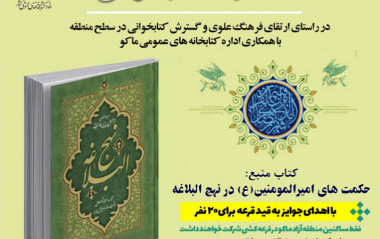 مسابقه کتابخوانی (نهج البلاغه) ویژه ماه مبارک رمضان برگزار می شود مدیرفرهنگی و آموزش سازمان منطقه آزاد ماکو گفت: مسابقه کتابخوانی ویژه ماه مبارک رمضان با کتاب مرجع نهج البلاغه توسط سازمان منطقه آزاد ماکو و با همکاری اداره کتابخانه های عمومی ماکو برگزار می شود.
