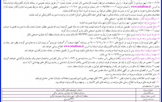 مزایده عمومی «بهره برداری از پروژه آبگرم شهرستان شوط بصورت اجاره» نوبت اول مزایده عمومی «بهره برداری از پروژه آبگرم شهرستان شوط بصورت اجاره» نوبت اول، توسط سازمان منطقه آزاد تجاری ـ صنعتی ماکو منتشر شد.