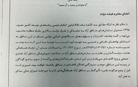 دبیر دولت طی بخشنامه ای صدور هرگونه مقرره توسط دستگاههای اجرایی در ارتباط با مناطق ازاد را منوط به هماهنگی بادبیرخانه شورای عالی نمود
