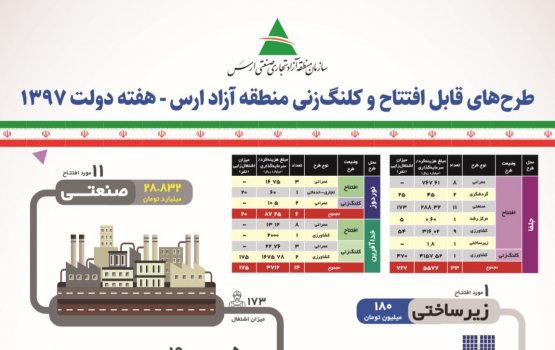 2 / اینفوگرافی | هفته دولت | افتتاح پروژه های منطقه آزاد ارس در یک نگاه همزمان با هفته دولت، پروژه های منطقه آزاد ارس در بخش های فرهنگی، عمرانی، تولیدی و صنعتی و سرمایه گذاری با حضور مرتضی بانک مشاور رییس جمهور و دبیر شورایعالی مناطق آزاد و ویژه اقتصادی افتتاح و کلنگ زنی می شود.