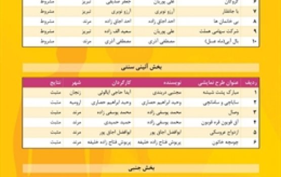 او گفت: از 46 طرح بازبینی شده 10 طرح جهت شرکت در بخش مسابقه، 6 طرح در بخش آیینی سنتی و 2 طرح در بخش جنبی پذیرش شدند.