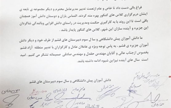 ما دانش آموزان پیش دانشگاهی و سال سوم دبیرستان های قشم از طرف خود و دیگر دانش آموزان جزیره قشم، به پاس توجه ویژه عاملان عادل و کارگزاران تدبیر منطقه آزاد قشم به خصوص از جنابعالی و آقایان مهندس حقدل و مهندس صادقی صمیمانه تشکر می کنیم. امید است سال های آینده نیز این شیوه ادامه داشته باشد.