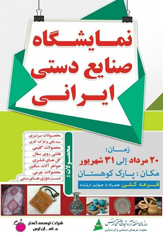 به گزارش فرینا، نمایشگاه صنایع دستی ایرانی منطقه آزاد ارس در پارک کوهستان شهر جلفا دایر شده است و تا پایان شهریور ماه 96 هر روزه در معرض دید گردشگران و ساکنان منطقه آزاد ارس قرار دارد.