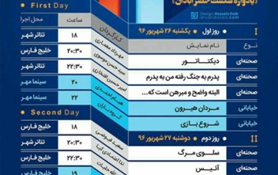 وی در پایان گفت : هیئت داوران این جشنواره شامل حسین مسافر آستانه ، جمشید خانیان و فرهاد قائمی مهدوی است و این جشنواره از 26 الی 28 شهریور ماه جاری در سالن های نمایش آبادان و خرمشهر برگزار می گردد.