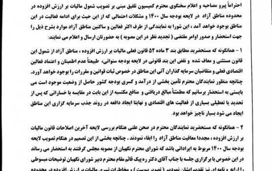 احتراماً پیرو مصاحبه و اعلام سخنگوی محترم کمیسیون تلفیق مبنی بر تصویب شمول مالیات بر ارزش افزوده در محدوده مناطق آزاد در لایحه بودجه سال 1400 و مشکلات احتمالی که از این حیث برای ادامه فعالیت در این مناطق بوجود خواهد آمد ، این شورا به نمایندگی از طرف اکثر فعالین و ساکنین مناطق آزاد موارد بشرح ذیل را جهت استحضار و صدور اوامر مقتضی (تجدید نظر در این مصوبه) به حضورتان ارسال و اعلام می نمایید: