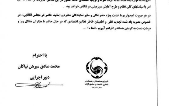 در هر صورت امیدواریم با عنایت ویژه حضرتعالی و سایر نمایندگان محترم و اساتید حاضر در مجلس انقلابی، در خصوص مصوبه یاد شده تجدید نظر و اطمینان خاطر فعالین اقتصادی که در حال حاضر با هزاران مشکل ریز و درشت دست به گریبان هستند را فراهم آوریم. انشا ء ا… .»