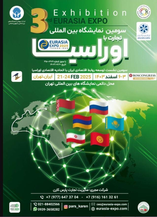 سومین دوره نمایشگاه بینالمللی تجارت با اوراسیا (EURASIA EXPO 2025) از 3 تا 6 اسفندماه 1403 در محل دائمی نمایشگاههای بینالمللی تهران برگزار میشود.