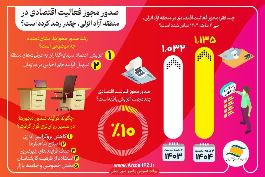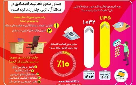 عضو هیئتمدیره و معاون توسعه اقتصادی و سرمایهگذاری سازمان منطقه آزاد انزلی، از صدور 1135 فقره مجوز فعالیت اقتصادی در محدوده این منطقه طی چهار ماه نخست سال جاری خبر داد که بیانگر رشد 10 درصدی نسبت به مدت مشابه سال گذشته است.