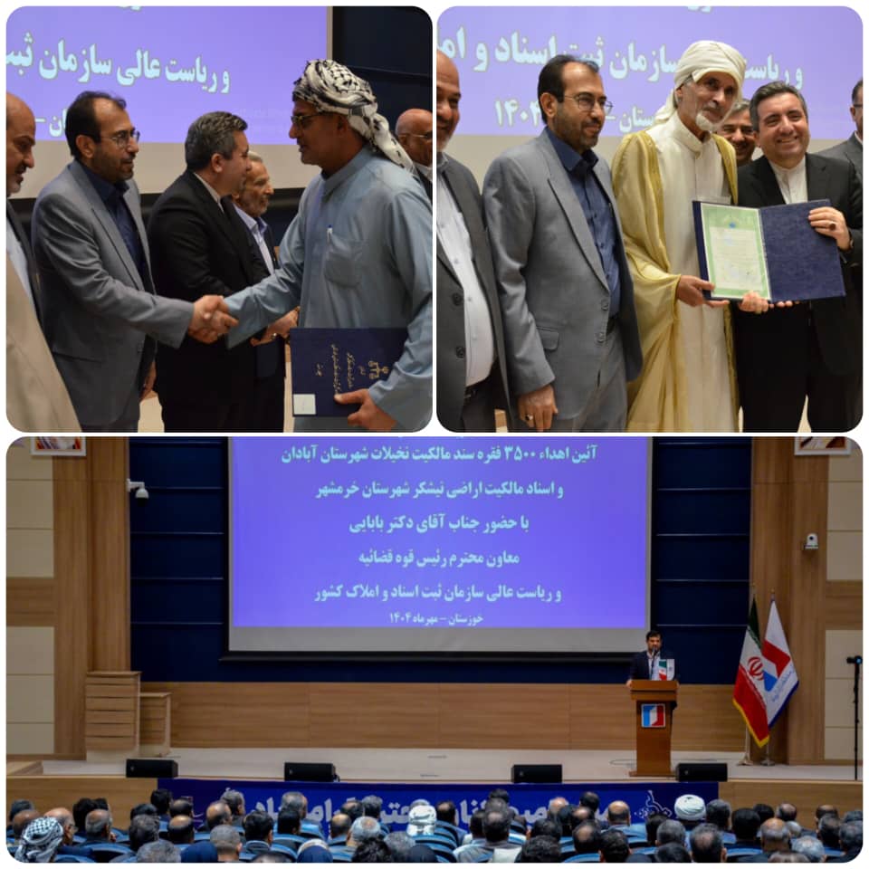 در پایان مراسم، اسناد مالکیت مربوط به بخشی از نخیلات آبادان و اراضی نیشکر خرمشهر به مالکان تحویل داده شد. این طرح با همکاری سازمان ثبت اسناد و املاک کشور، دادگستری خوزستان و سازمان منطقه آزاد اروند اجرا میشود و هدف آن، ساماندهی مالکیت و کاهش اختلافات ثبتی در جنوب خوزستان است.