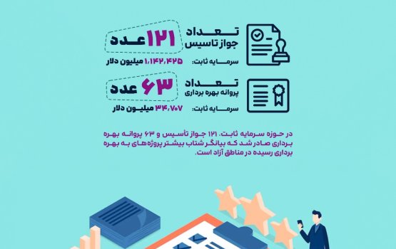 در حوزه سرمایه ثابت 121 جواز تأسیس و 63 پروانه بهره برداری در مناطق آزاد صادر شد که بیانگر شناب بیشتر پروژه‌های به بهره‌برداری رسیده در مناطق آزاد است.